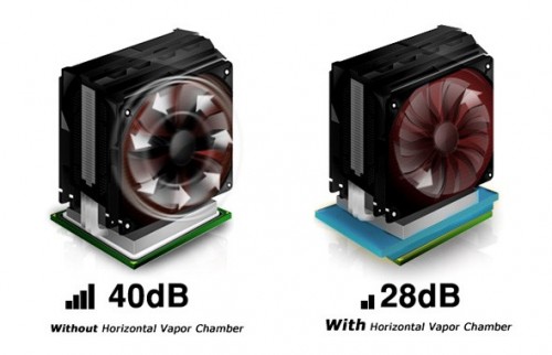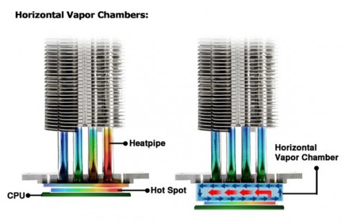Cooler Master Quickly takes next step with Vapor Chamber Technology James White August 8, 2012 Press Release The two most important aspects of a CPU cooler are heat dissipation capacity and efficiency. Basically it is all about how much heat can it absorb and how fast can it do it. The issue is the objective of spreading the heat generated by the CPU over a large surface area is now more difficult due to current generation CPUs having some sections that generate more heat than others. Well, Cooler Master Vapor Chamber Technology could be the answer. Instead of using a solid metal block at the bottom of the CPU cooler, a Horizontal Vapor Chamber system will instead contain a vaporized mixture. When the CPU generates heat from anywhere on its surface, the vapor will absorb the heat, and distribute it across the entire surface of the heat sink, not just the local area. The actual changes in phases from liquid to gas and back create a circulation of heat up to 8 times more efficient than traditional coolers. Other coolers have been doing something similar with the heat pipes for years, but Cooler Master is moving this to apply to the base of the cooler as well. The upcoming Cooler Master V4 GT, first to have CM Vapor Chamber Tech, should be an interesting cooler. It can be smaller with a lower speed fan without losing overall heat dissipation when compared to other coolers. Thanks to AMD Core Boost and Intel Turbo Boost, better temperature control could improve your system performance. [hide-this-part morelink=”Full Press Release”] July 31st, 2012 – Cooler Master announces further integration of Vapor Chambers into its retail Heatsinks. After releasing the world’s first heatpipe heatsink in 2000, and the first vertical vapor chamber Heatsink in early 2012, Cooler Master today announces broader adoption of Vapor Chamber Technology developed by Cooler Master’s OEM and industrial cooling division in its retail Heatsinks. After the success of the TPC812 pioneering the use of modern vertical vapor chambers, Cooler Master is expanding the TPC series and will equip selected Models of the V series with Horizontal Vapor Chambers. Horizontal Vapor Chambers spread Heat 8x faster than solid copper, eliminating hot spots and spreading heat evenly across the base of a heatsink. Since the vapor chamber effectively increases the heatpipe contact area, it allows the use of a larger number of heatpipes. Overall Horizontal Vapor Chambers enable faster and more efficient transfer of heat from the CPU to the heatpipes and fins, resulting in lower temperatures and slower, less noisy fans. Modern processors feature multiple CPU cores and integrated GPUs, resulting in hot spots, tiny parts of the CPU that product significantly more heat than others. Thanks to advanced thermal management, processors can boost the speed of individual cores if the processor is cooled well enough. Horizontal vapor chambers help eliminate hot spots and remove heat at unprecedented speeds, allowing your CPU to boost its performance and notably improve system performance. Vertical Vapor Chambers allow Cooler Master to develop Heatsinks that help your system run cooler, quieter, and faster. The first Cooler Master Heatsink equipped with a horizontal vapor chamber, the V4 GT, will be officially released to the market in Q3, 2012. For more information on how Vapor Chambers work, please visit: http://odm.coolermaster.com/manufacture.php?page_id=9 [/hide-this-part] Share This With The World!